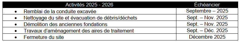 Les travaux se poursuivront jusqu'en décembre 2025, après quoi le site sera fermé pour la période hivernale 2025-2026. La réhabilitation complète reprendra au printemps 2026, selon les conditions météorologiques.