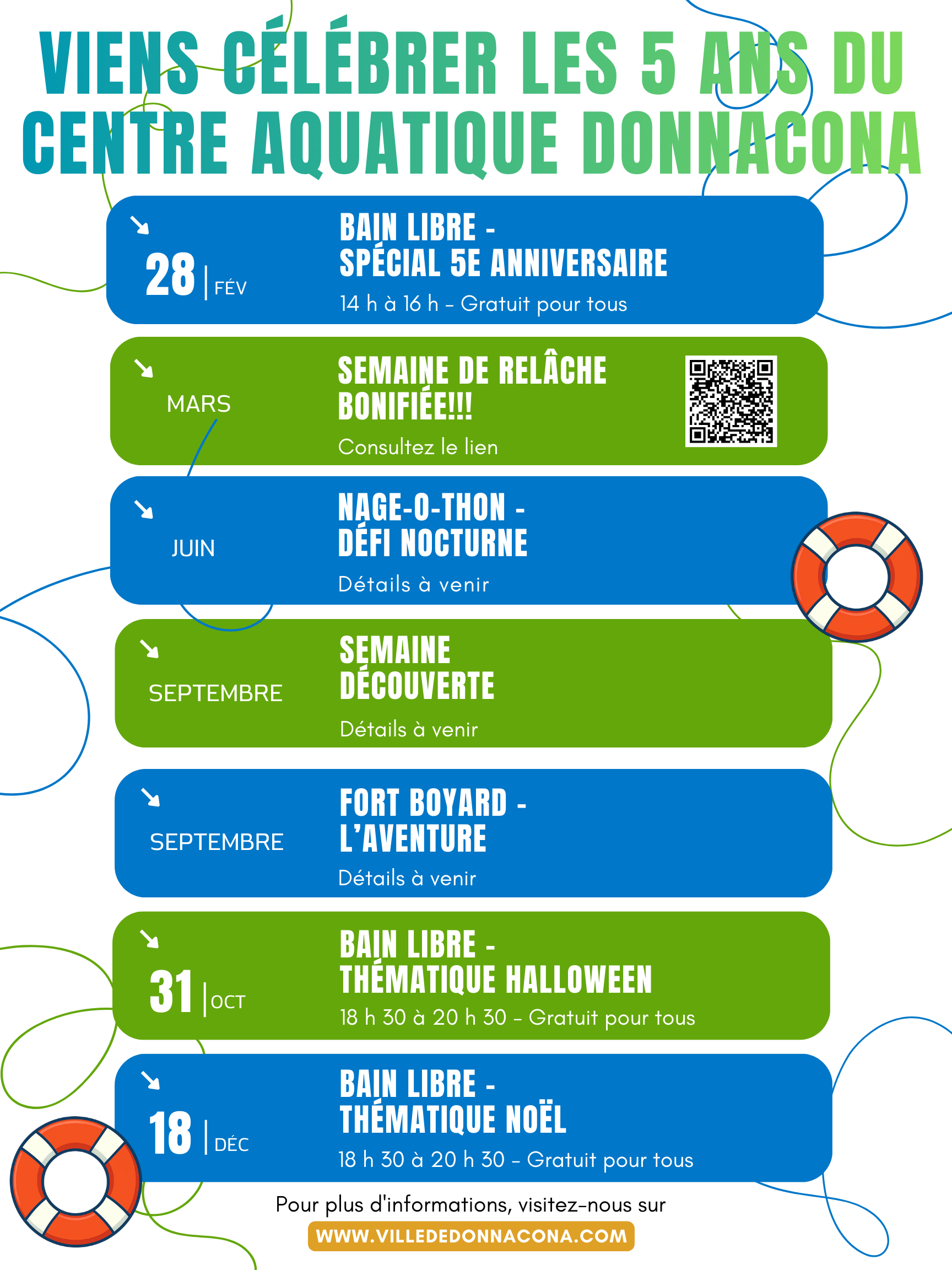 Pour souligner cet anniversaire, notre équipe vous a préparé une programmation spéciale qui se déploiera tout au long de l'année! Bains libres thématiques, défis, semaines bonifiées et activités familiales seront au rendez-vous. Il y en aura pour tous les goûts et tous les âges.