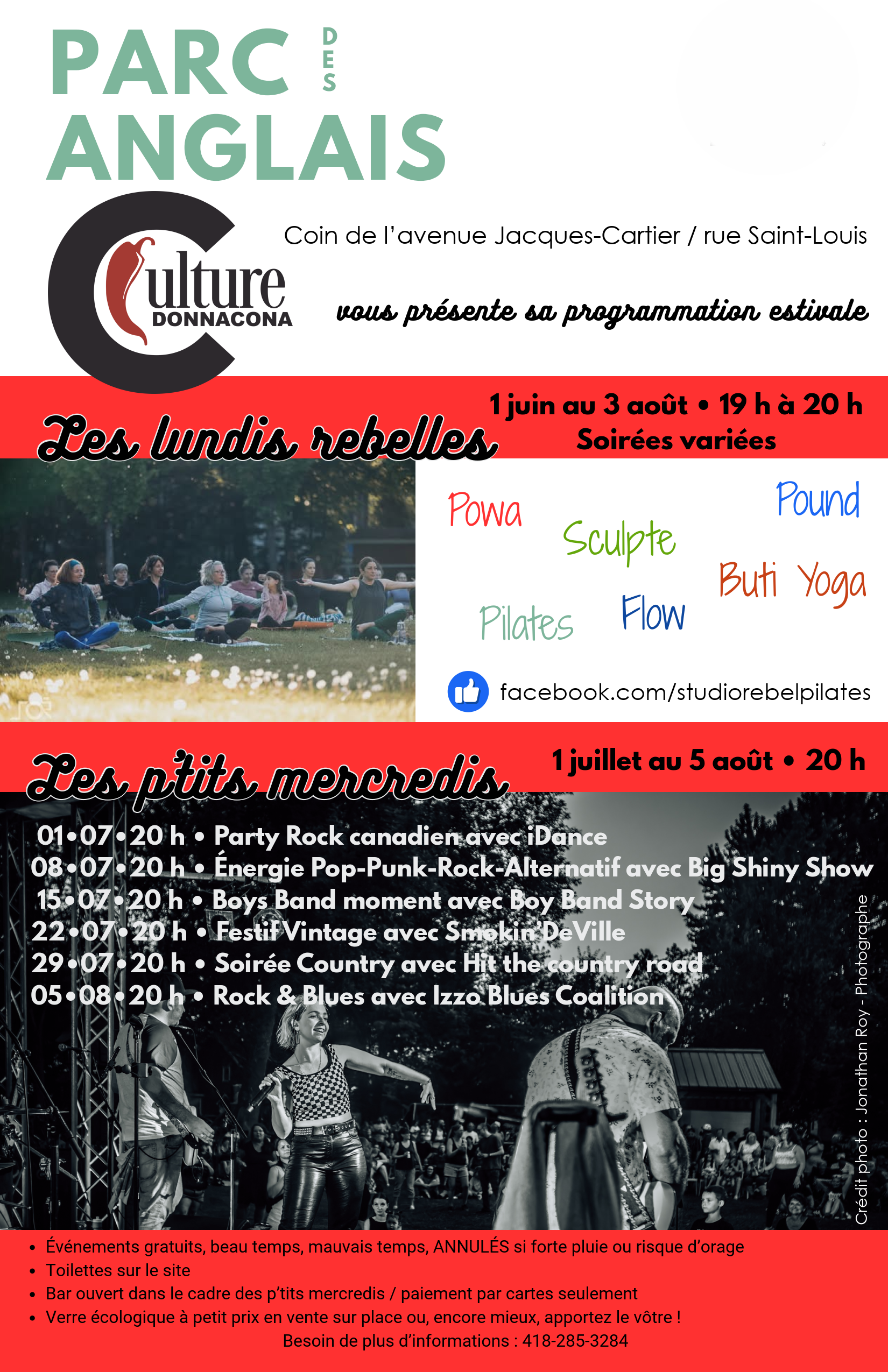 Tous les mercredis du 1er juillet au 5 août, à 20 h. Chaque semaine, une ambiance différente vous attend : rock, country, blues, vintage... Il y en a pour tous les goûts!